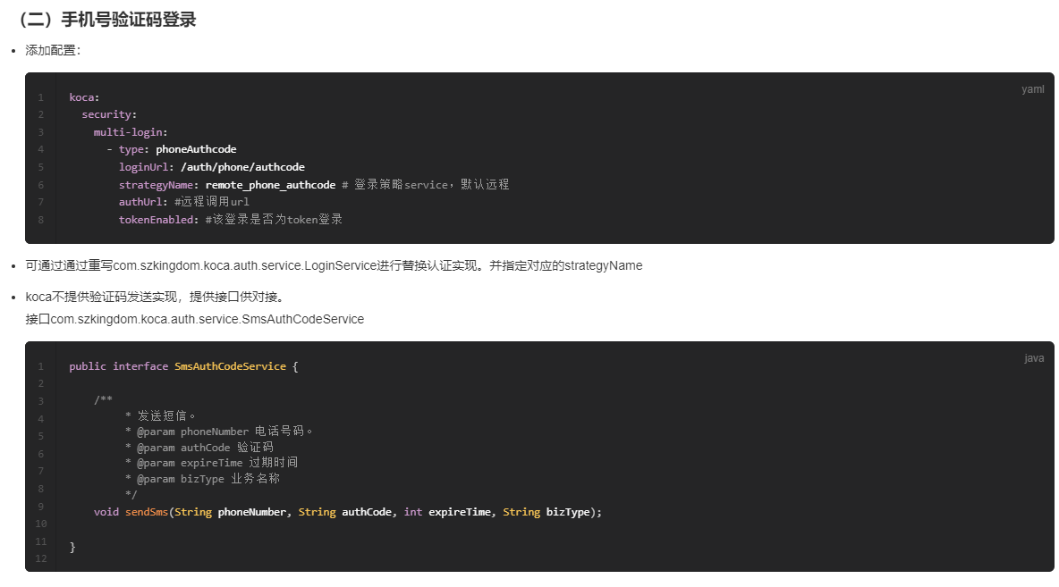 KOCA版本 :3.4 KOCA模块 : 模块版本 :3.4 场景 :安全认证登录 问题 :使用框架的手机号验证码登录,除了要提供验证码发送实现,还要实现什么? 报错细节 : 尝试解决方案: